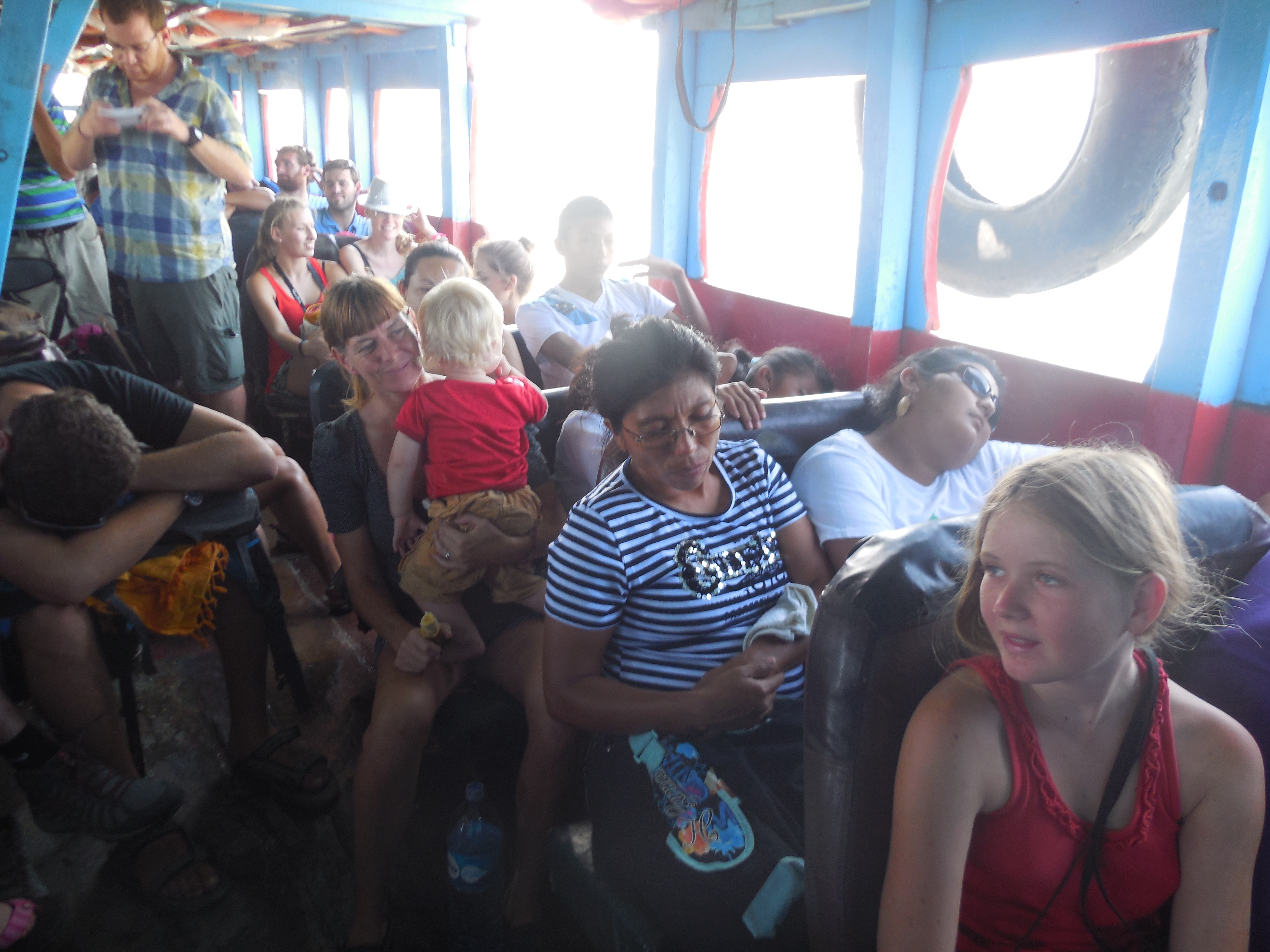 My mum was annoyed at the ultimate traveller because he said we would have to sit on the floor of the top deck and there was no space and it wasn’t safe for a baby. Whilst my mum was getting frustrated he had already put the luggage on so that made her angrier. She was saying,” I am not getting on there with Jed,no way,you’re mad,we will wait for the next boat, Ian!”. But in the end we got on and went to the bottom floor which was really crowded and had water on the floor.