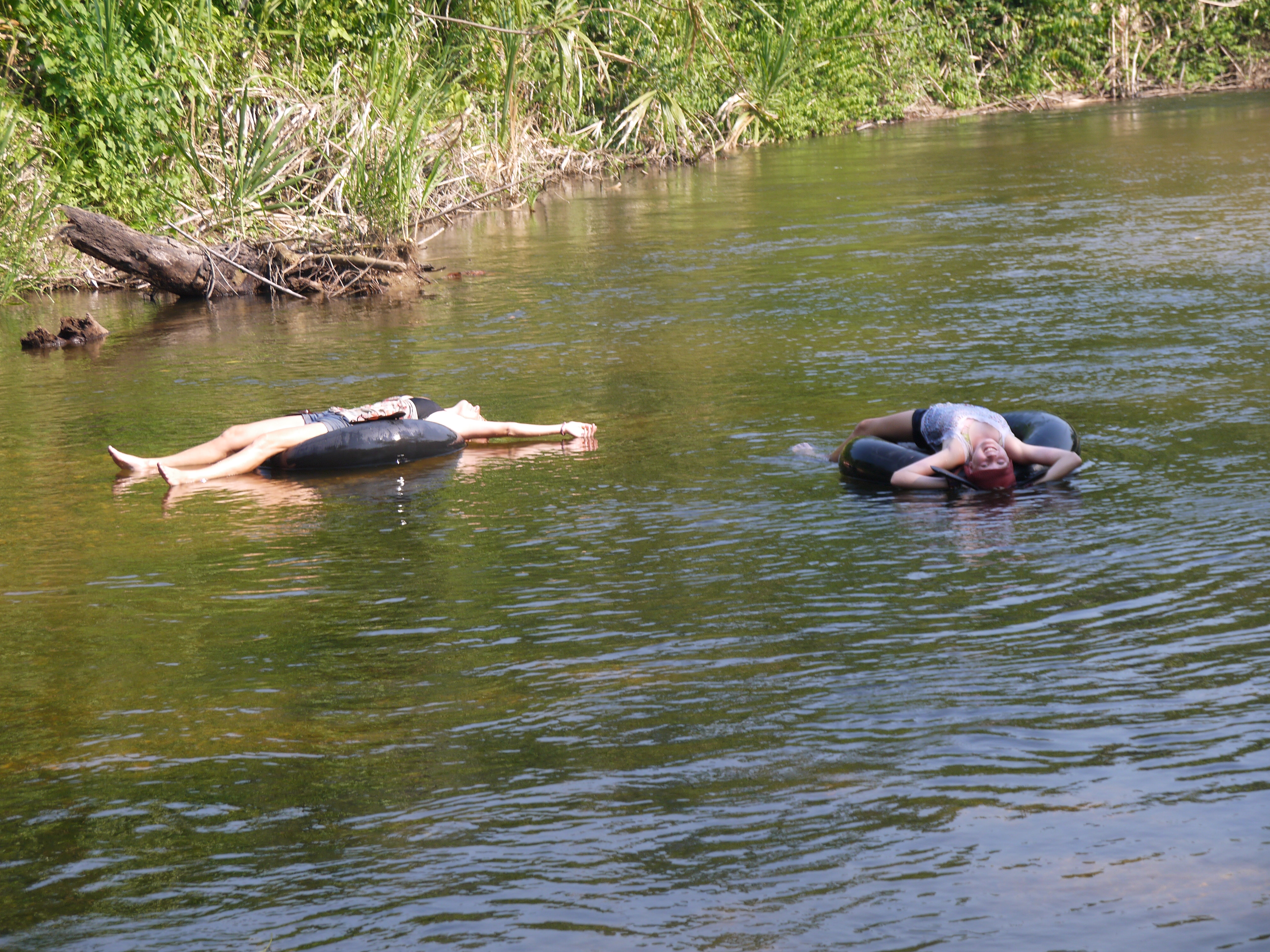When we got to the reception we asked if we could go tubing and paid a bit ,collected 2 tubes (these tubes had a wider hole than the ones at Semuc Champey) and followed the signs down to the river. Since it was so hot it seemed like a really long walk but it was only probably 20 minutes. When we got to the river there was this couple trying to fit a small day bag into a plastic bag so it wouldn’t get wet(they might of been 30 minutes here before us trying to do what they were doing but we had nothing on us except clothes so we just jumped in).