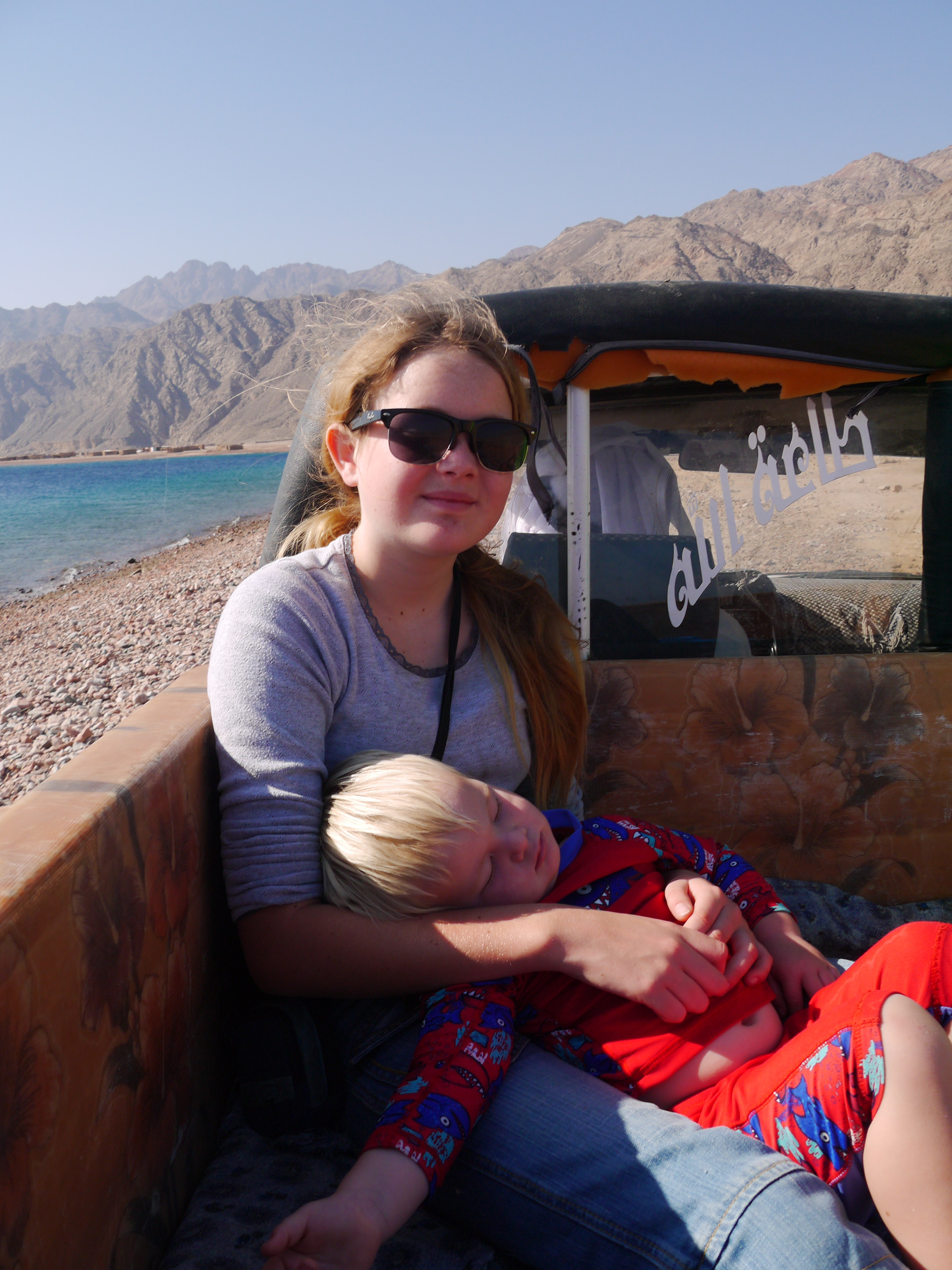My poor mum was squashed on with Jed and couldn’t move. Jed was really good and didn’t complain at all. The first “camp” we arrived at was just inside the national park of Ras Abu Galum.