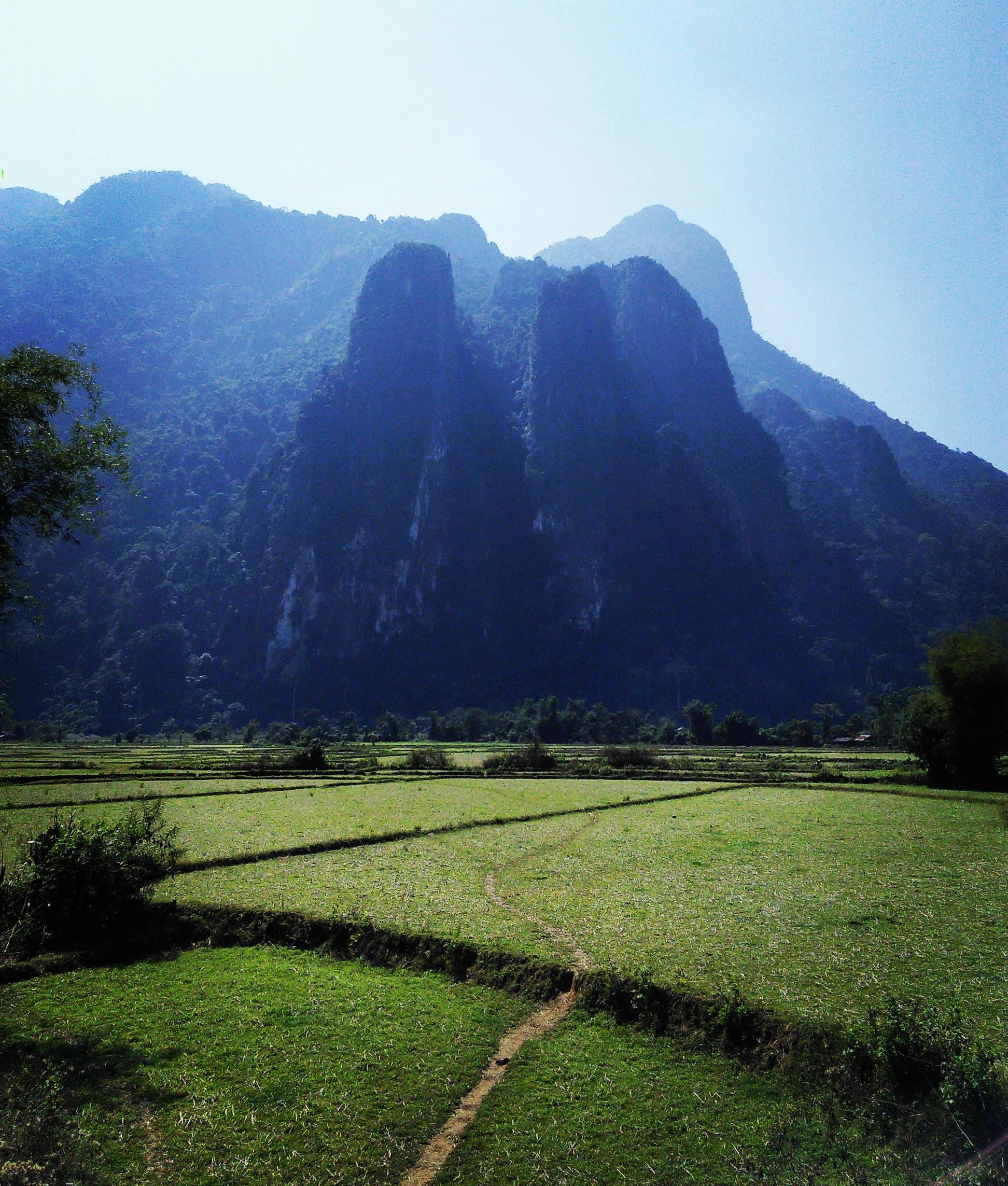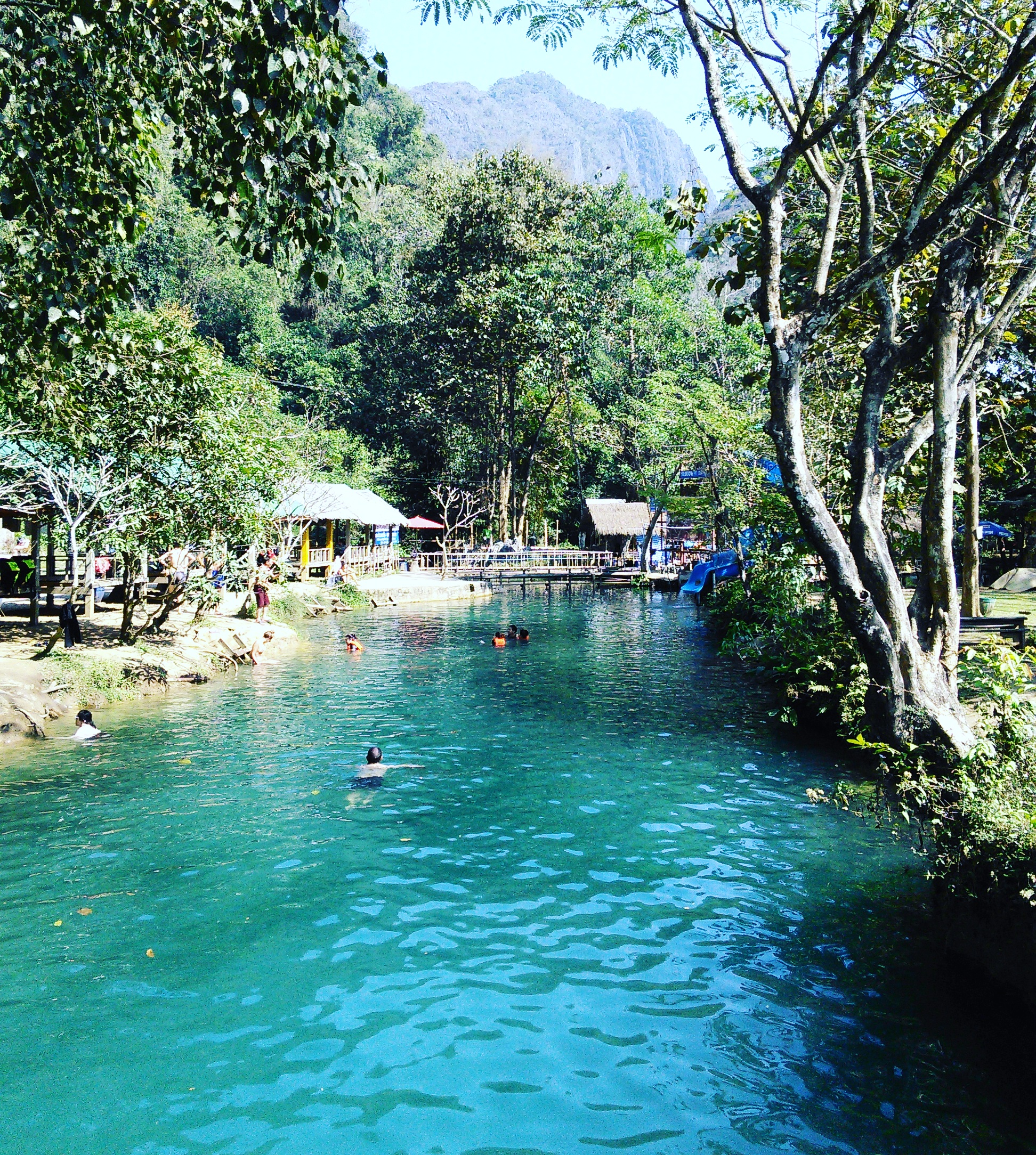 We took a mini bus from Vientiane to Vang vieng 7 hours away with some fussy travellers. Once we were close to our destination, we knew it without a doubt. Mountains appeared, deep jungle and the sound of waterfalls.